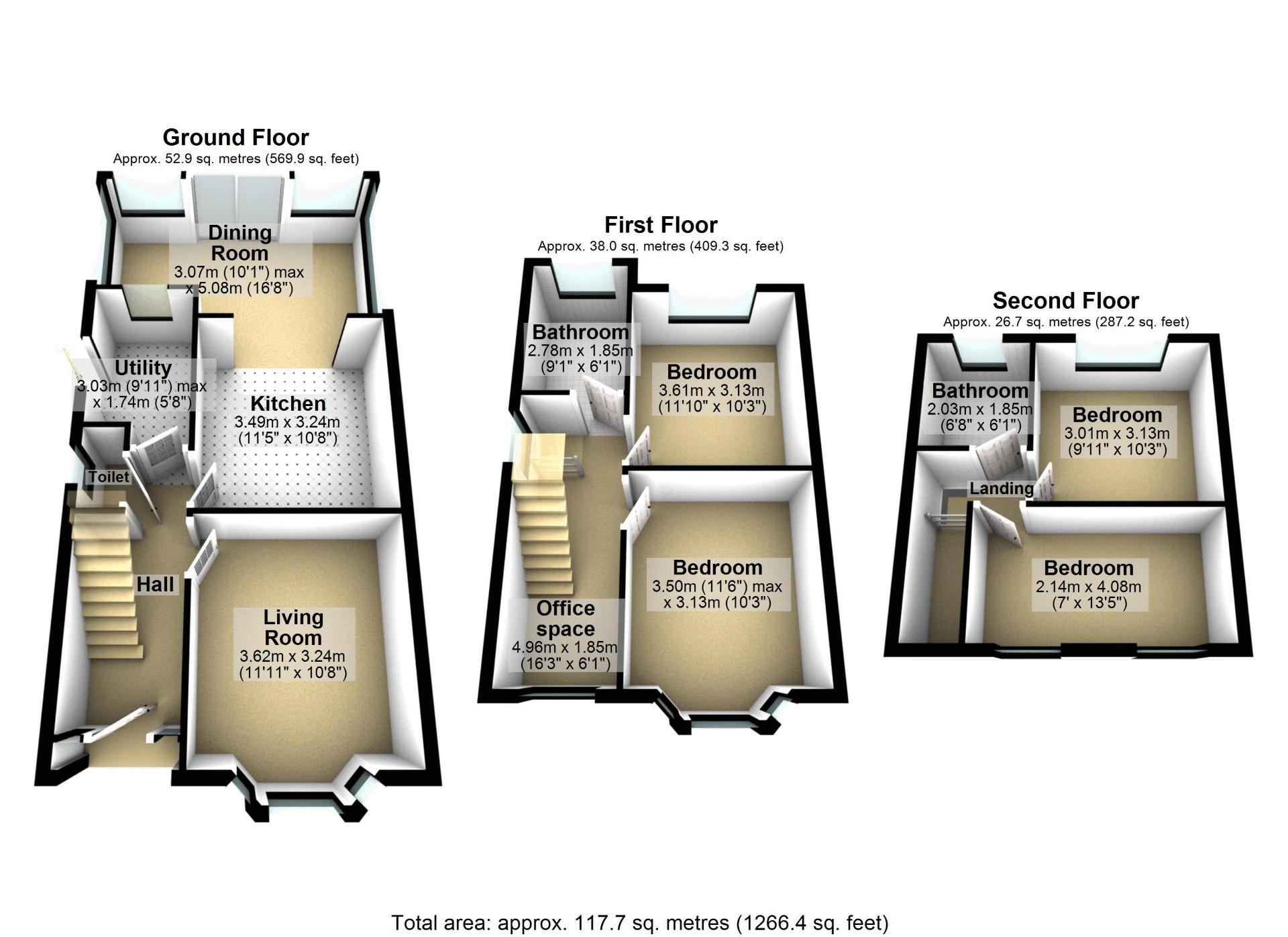 To the first floor are two double bedrooms, a stylish family bathroom and a bright, airy landing, while the top floor provides two further bedrooms and a shower room.