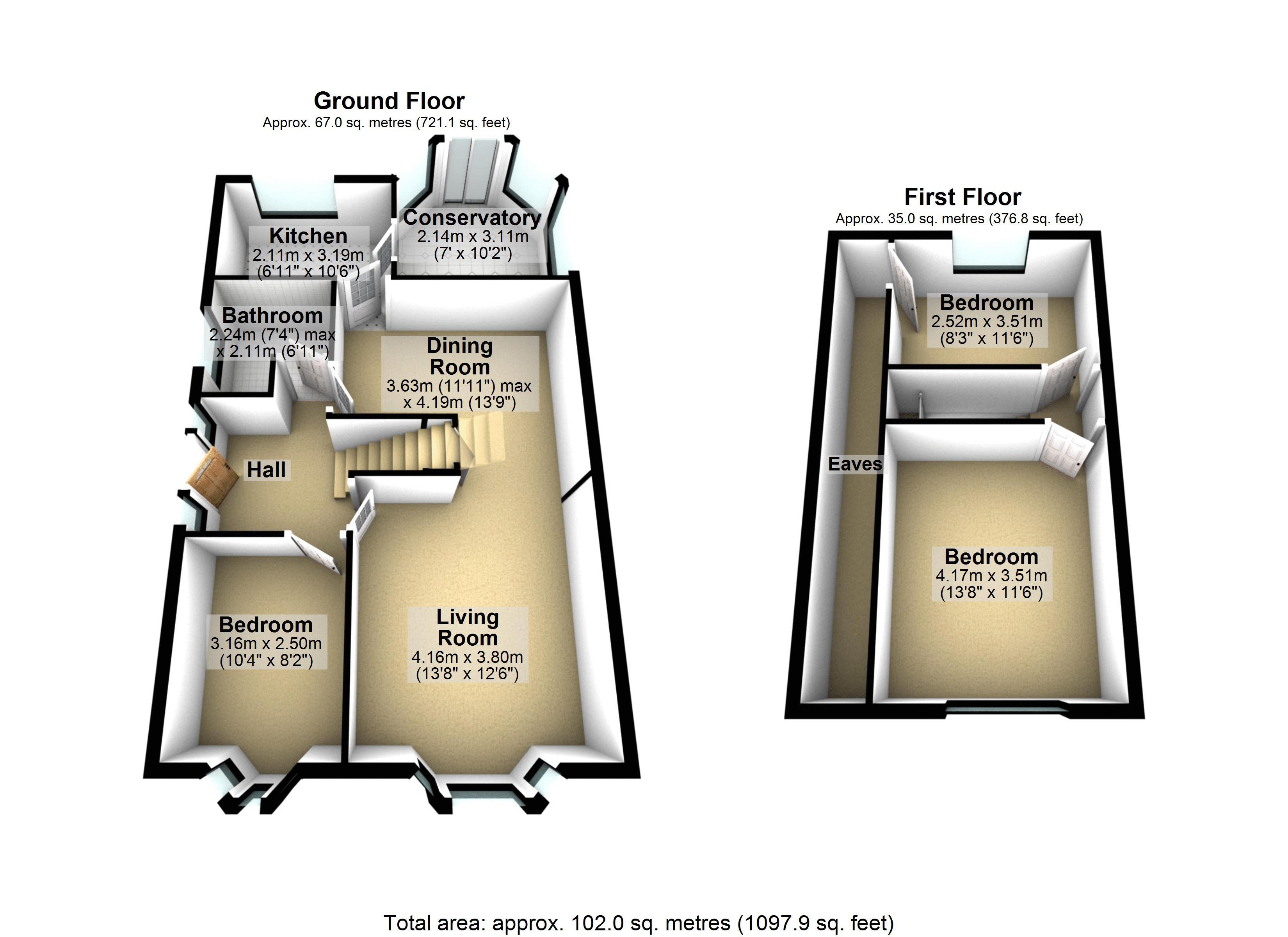 To the first floor are two spacious double bedrooms, while the ground floor comprises a third bedroom, family bathroom, a welcoming living room, and a dining area opening into the kitchen and conservatory, providing flexible living and entertaining space filled with natural light.