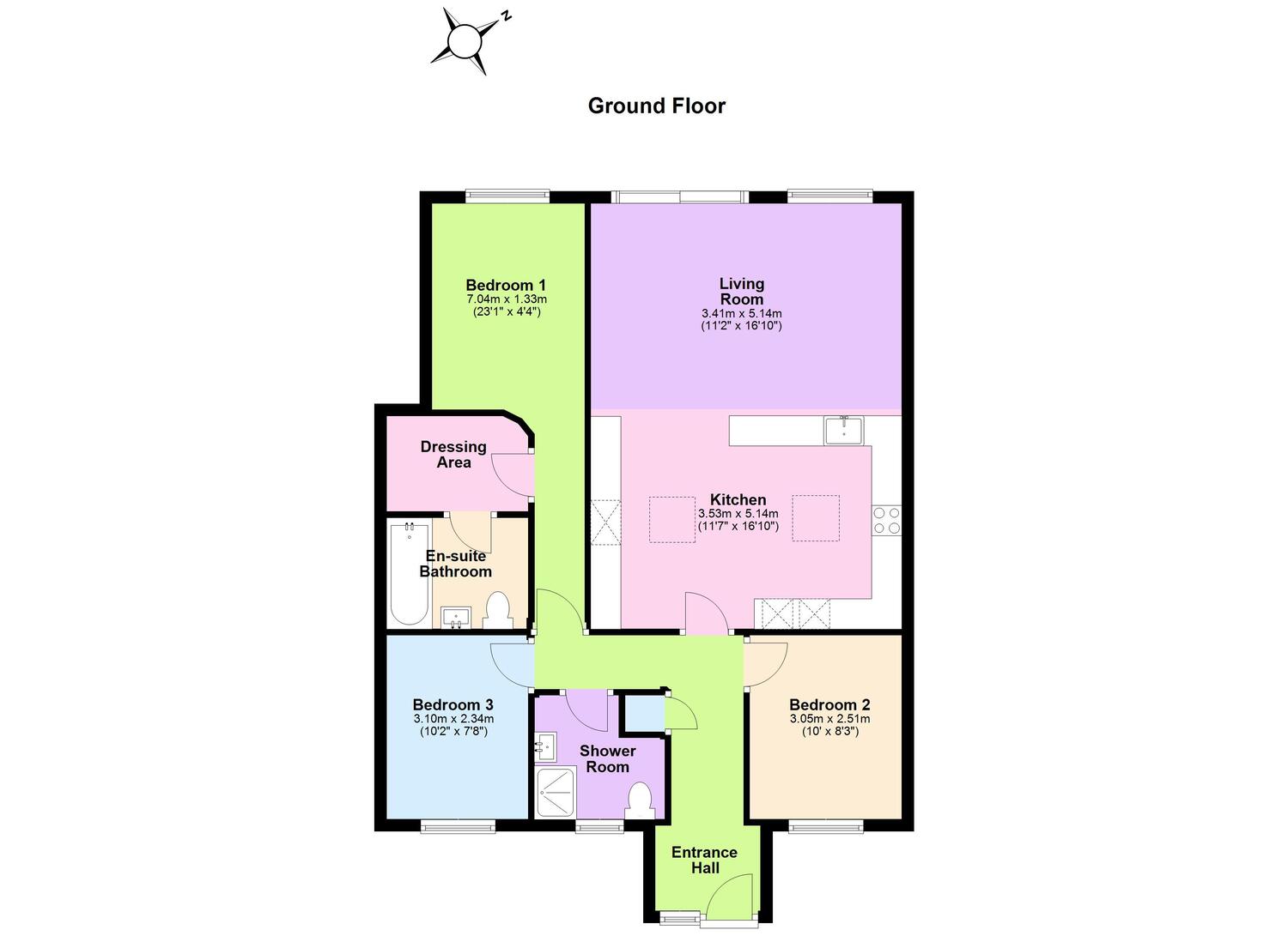 The principal bedroom is also located to the rear of the property and offers a peaceful retreat, complete with a walk-in wardrobe and a well-appointed en suite bathroom. There are two further double bedrooms to the front of the bungalow, along with a modern family shower room, making the layout equally suitable for families, downsizers or those seeking flexible accommodation.