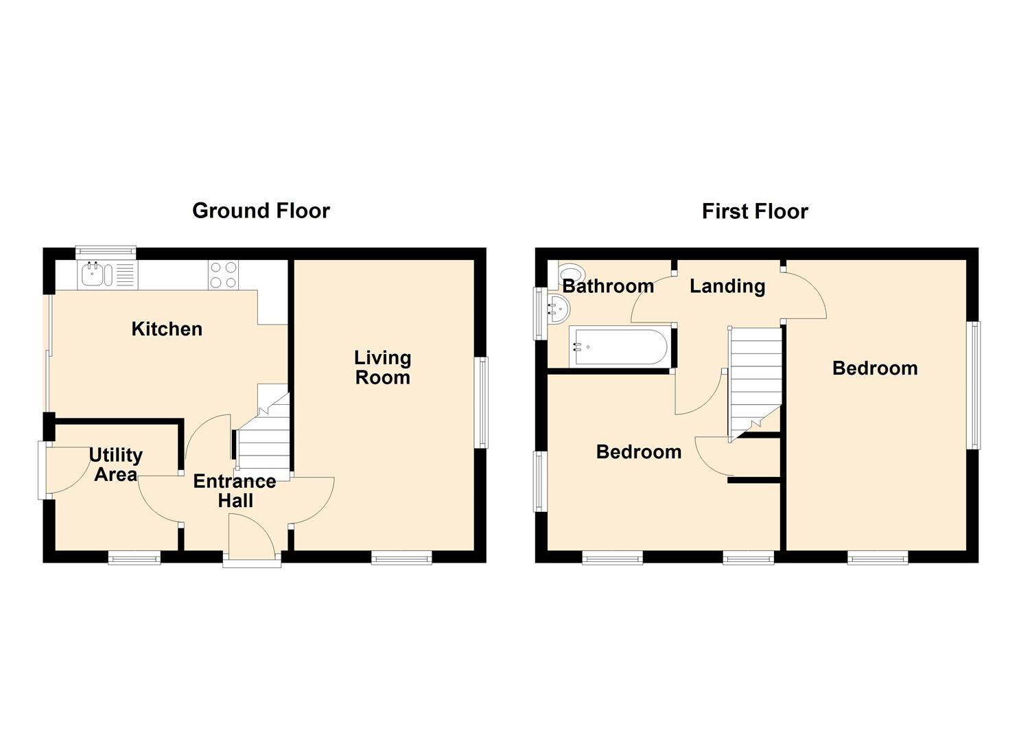 The accommodation comprises a spacious living room, a fitted kitchen, and an additional utility space to the ground floor, providing flexible living and storage options. Upstairs, the property offers two well-proportioned double bedrooms and a family bathroom.