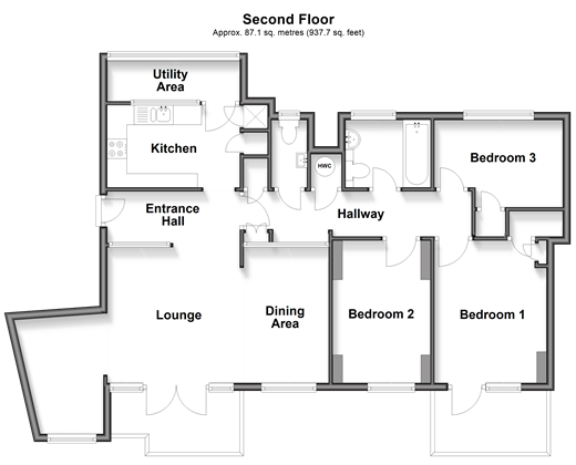 Please refer to the footnote regarding the services and appliances. Room sizes:Entrance HallDining Area: 9'6 x 6'6 (2.90m x 1.98m)Lounge: 19'3 x 12'1 (5.87m x 3.69m)BalconyKitchen: 11'1 x 6'9 (3.38m x 2.06m)Utility AreaBalcony To The Rear: 10'5 x 3'4 (3.18m x 1.02m)Inner HallwayBathroomSeparate CloakroomBedroom 1: 12'8 x 9'4 (3.86m x 2.85m)BalconyBedroom 2: 12'2 x 8'1 (3.71m x 2.47m)Bedroom 3: 10'7 x 7'3 (3.23m x 2.21m)Communal Gardens