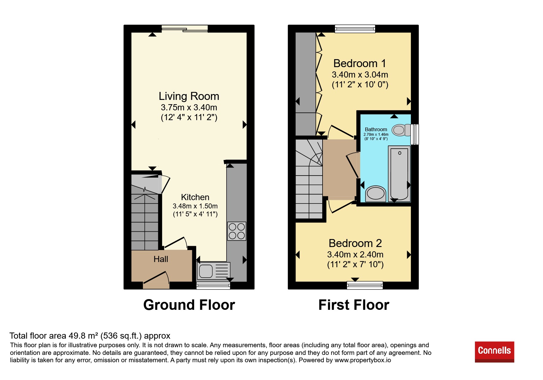 The accommodation comprises a welcoming living room leading through to a fitted kitchen/dining area, creating an open and sociable feel. Upstairs there are two good-sized bedrooms and a family bathroom.