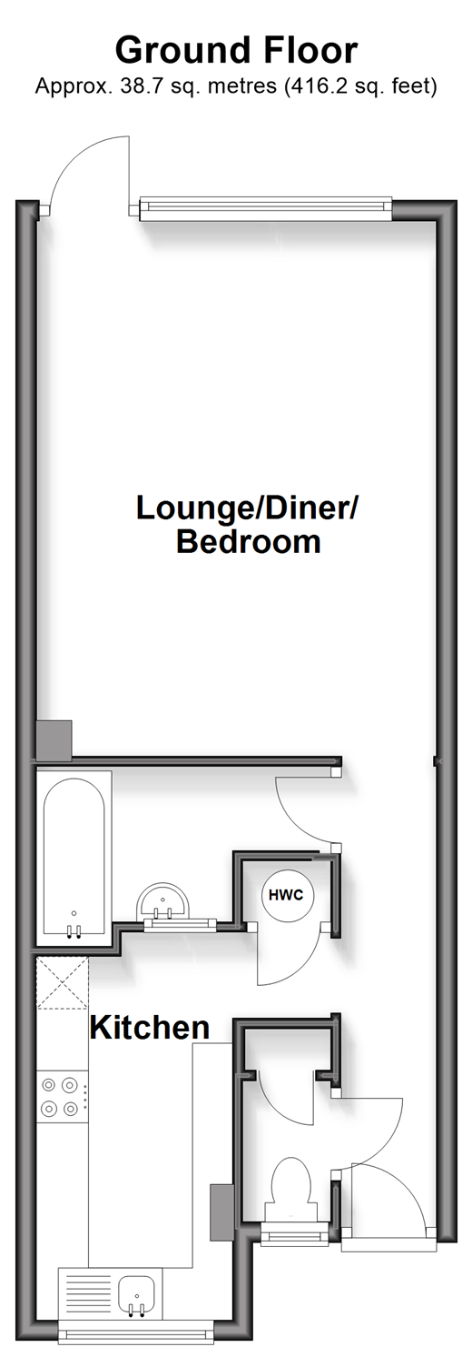 Please refer to the footnote regarding the services and appliances. Room sizes:Kitchen: 12'8 x 6'0 (3.86m x 1.83m)BathroomLounge/Diner/Bedroom: 17'6 x 12'5 (5.34m x 3.79m)Separate ToiletRear GardenAllocated Parking