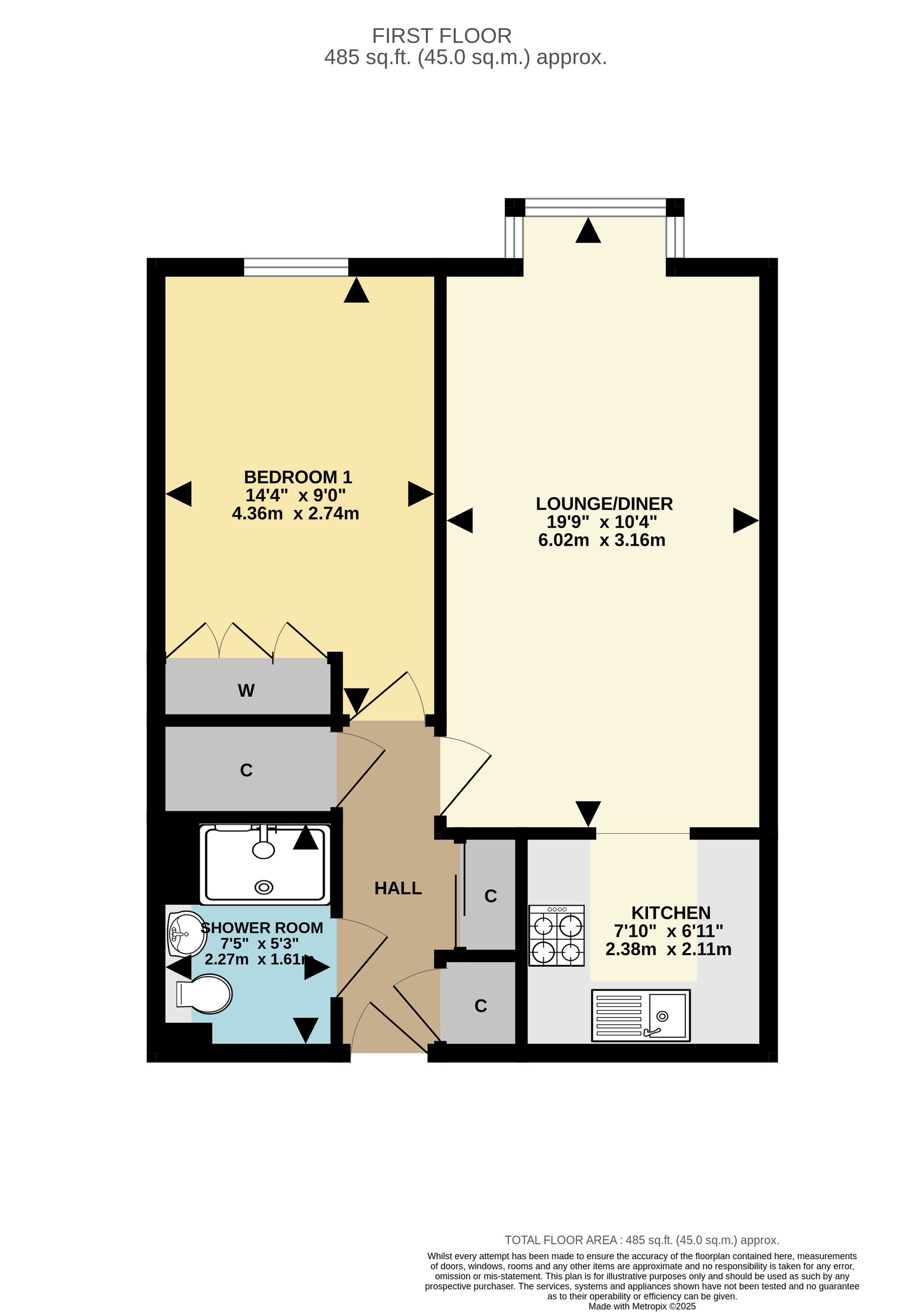 The generously sized bedroom comes complete with a fitted wardrobe, while the shower room features a white suite with a large double cubicle and fitted cupboards for added convenience.