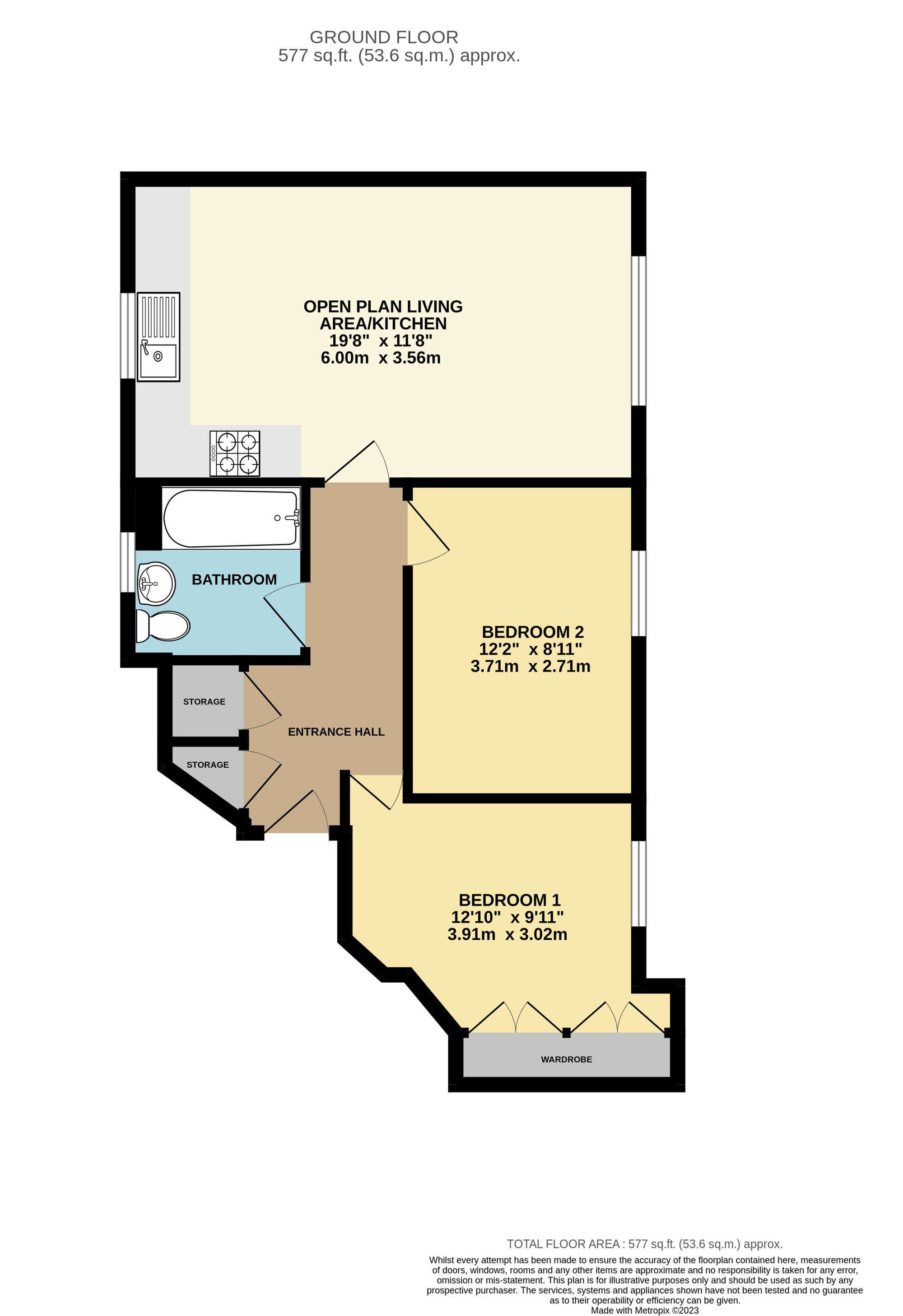 The open plan living and kitchen area is a real highlight, featuring dual aspect windows that allow natural light to pour in, creating a bright and airy feel. There is plenty of space to relax, dine and entertain. Both bedrooms are comfortable doubles, with the main bedroom benefiting from built in wardrobes. The family bathroom is fitted with a white suite and shower over the bath.
