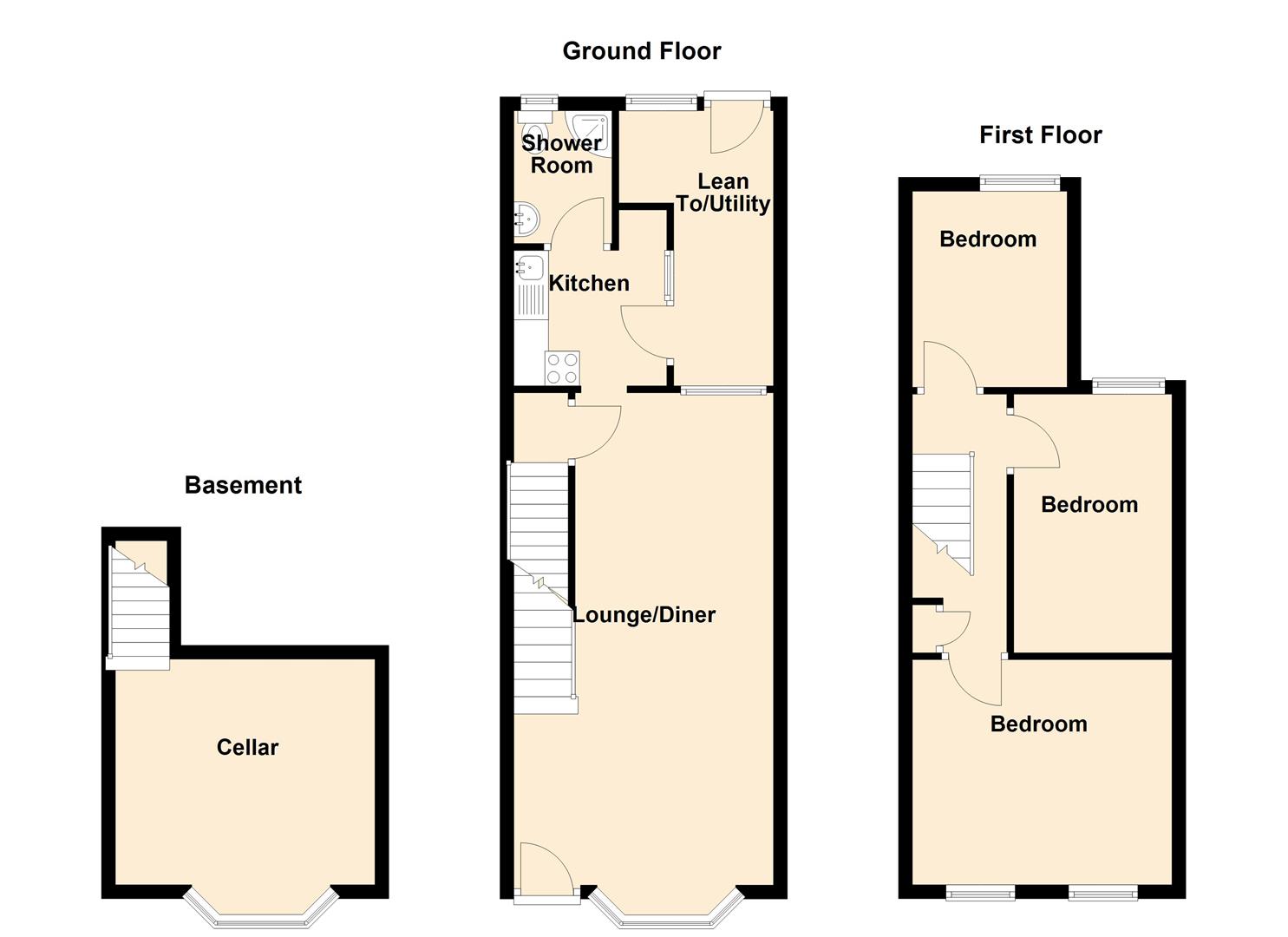 The ground floor features a generous lounge/diner, fitted kitchen, lean-to/utility area and shower room. Upstairs are three separate bedrooms, with the added benefit of a converted cellar providing useful additional space suitable for storage, a home office, or hobby room.