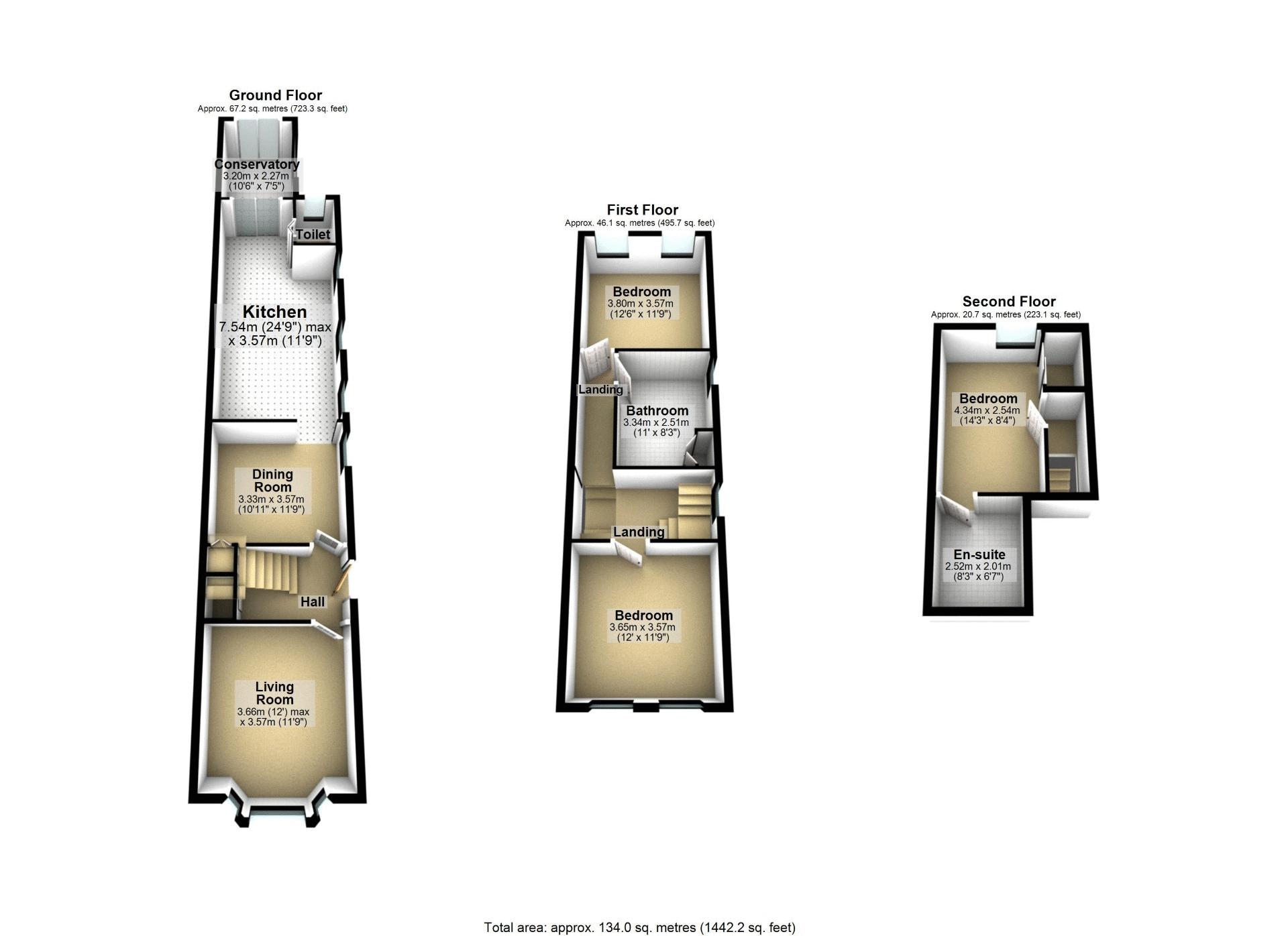 On the first floor are two large double bedrooms and a spacious family bathroom with separate bath and shower. The second floor features a further double bedroom with en-suite.