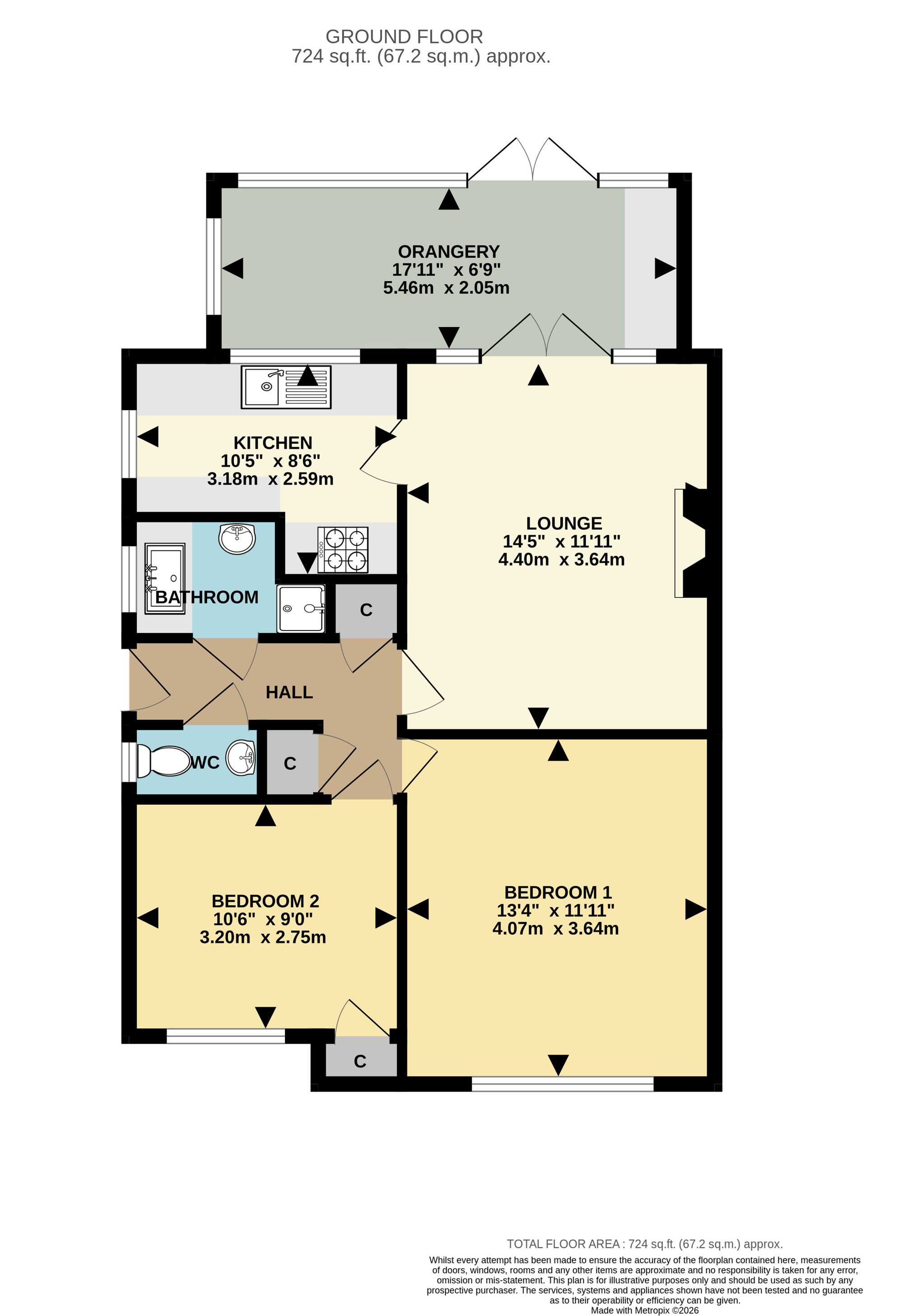 The kitchen enjoys a dual aspect that brings in plenty of natural light and features classic shaker style cabinetry with an integrated oven and hob. Both bedrooms are comfortable doubles positioned at the front of the home, with bedroom two benefiting from a handy built-in storage cupboard. The bathroom is fitted with a modern suite including a shower cubicle and a deep soaking tub designed for upright relaxation, along with a vanity unit sink and fully tiled walls. A separate W.C. sits conveniently across the hall.