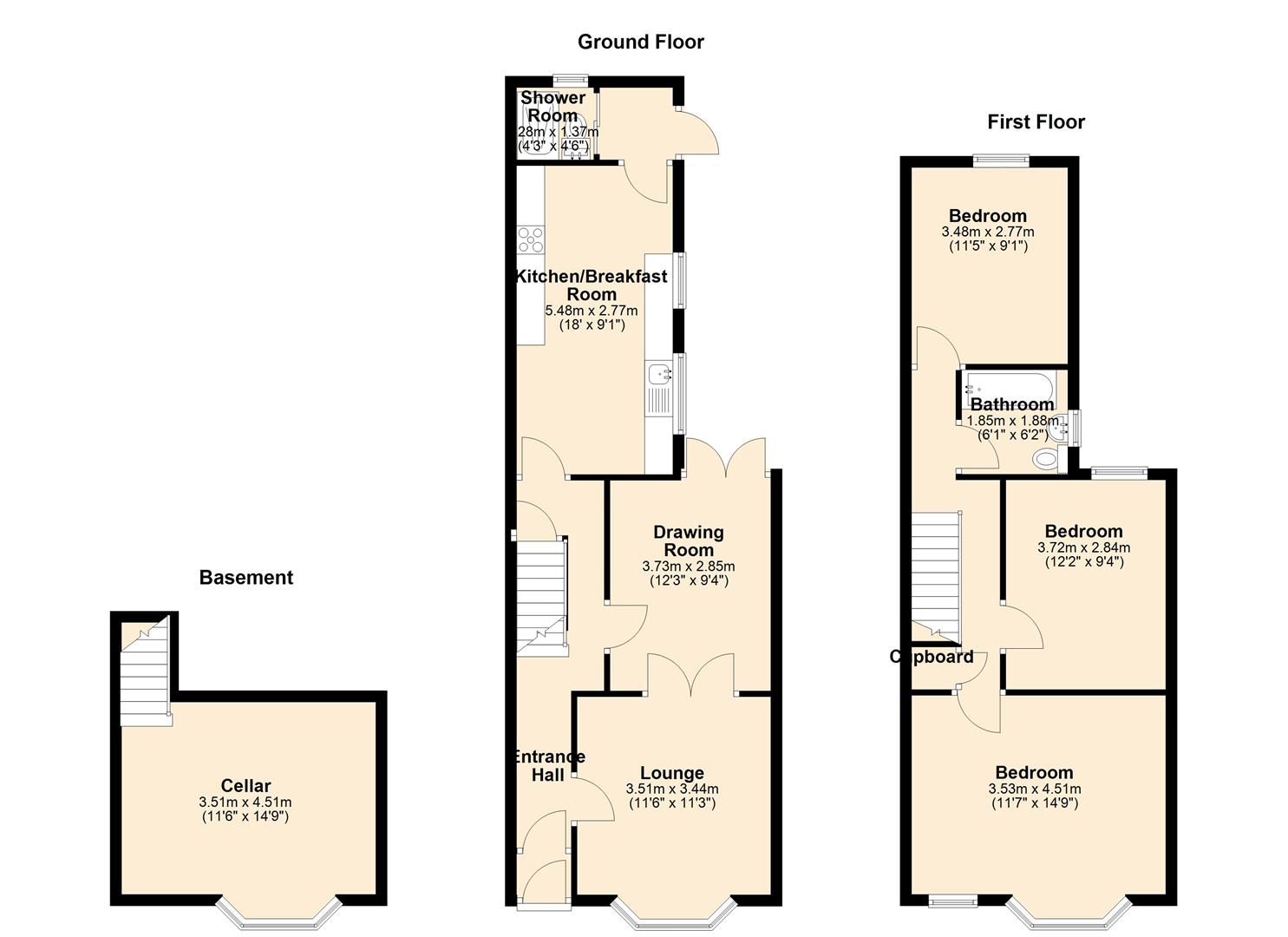The ground floor comprises a generous living room with separate dining area, a large kitchen/breakfast room, access to the cellar, and a modern shower room. To the first floor are three double bedrooms and a separate family bathroom. Externally, the property benefits from an enclosed rear garden.