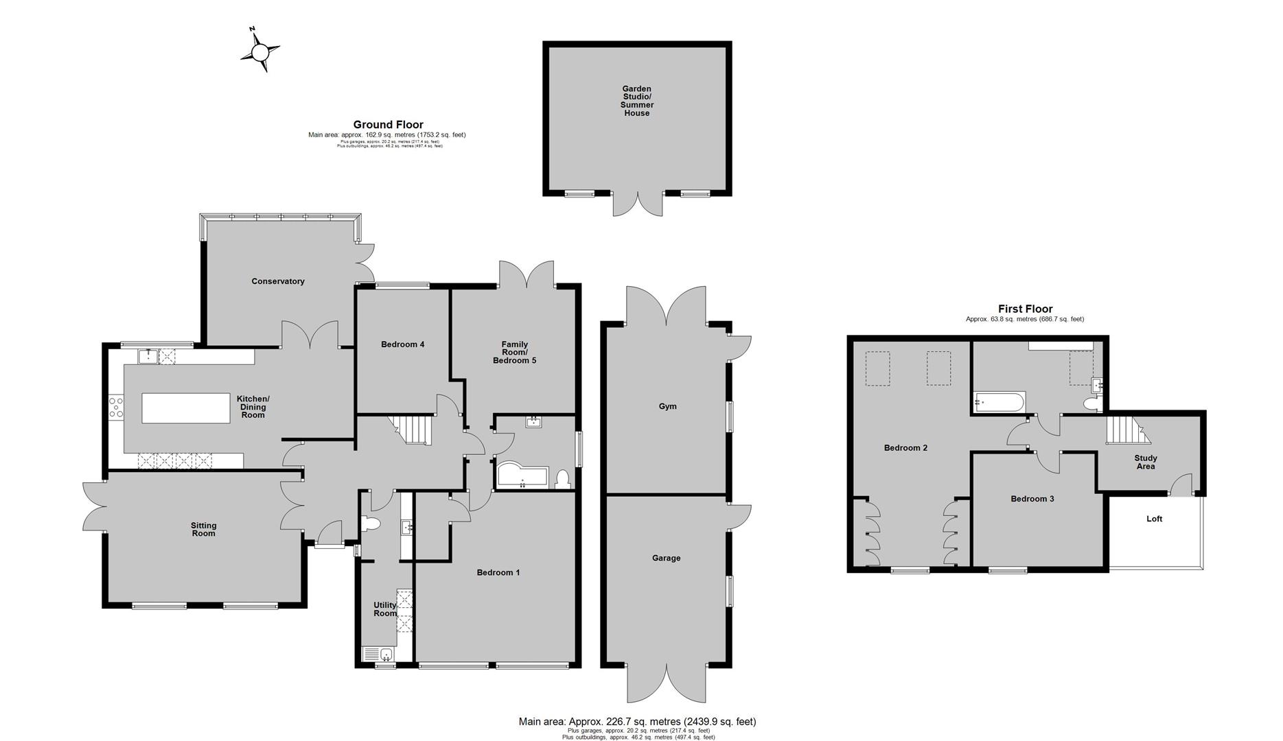 The thoughtfully designed interior provides exceptionally spacious and beautifully presented accommodation extending to 2439 sq ft (226 sq m). The ground floor is arranged to provide an entrance hall, sitting room with doors opening to the garden, a contemporary kitchen/dining room, a conservatory, three double bedrooms, a utility room, a stylish bathroom, and a cloakroom. To the first floor, there are two further double bedrooms, a study area, and a well-appointed bathroom.