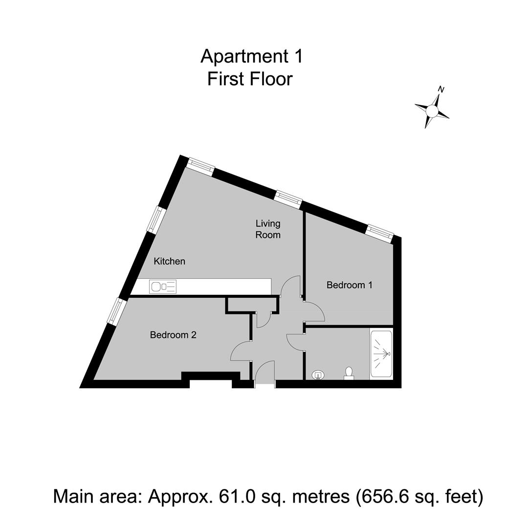 Apartment 1 provides bright, open-plan living accommodation comprising a spacious living room with contemporary kitchen, two bedrooms, and a stylish shower room.