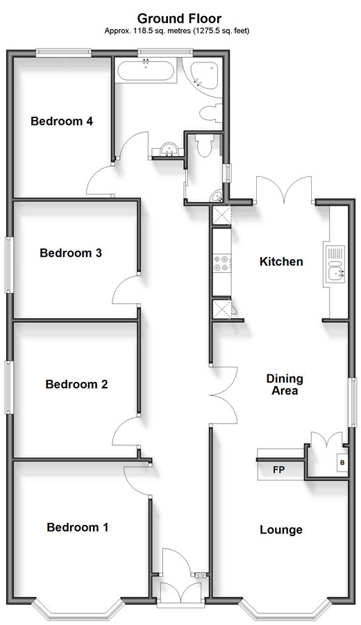 Please refer to the footnote regarding the services and appliances. Room sizes:Entrance PorchEntrance HallwayKitchen: 11'3 x 8'9 (3.43m x 2.67m)Lounge: 12'8 x 12'0 (3.86m x 3.66m)Dining Area: 12'10 x 10'7 (3.91m x 3.23m)Bedroom 1: 13'8 x 12'0 (4.17m x 3.66m)Bedroom 2: 13'8 x 10'8 (4.17m x 3.25m)Bedroom 3: 10'9 x 10'3 (3.28m x 3.13m)Bedroom 4: 12'4 x 8'5 (3.76m x 2.57m)Bathroom: 9'5 x 9'2 (2.87m x 2.80m)Separate CloakroomFront GardenRear GardenDriveway Parking