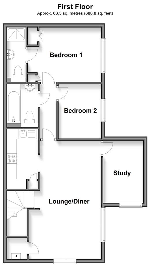 Please refer to the footnote regarding the services and appliances. Room sizes:Lounge/Diner: 19'8 x 10'2 (6.00m x 3.10m)Study: 10'4 x 6'8 (3.15m x 2.03m)Kitchen: 9'11 x 5'2 (3.02m x 1.58m)BathroomBedroom 1: 12'3 x 9'1 (3.74m x 2.77m)Ensuite Shower RoomBedroom 2: 9'1 x 7'0 (2.77m x 2.14m)Tandem Parking Space